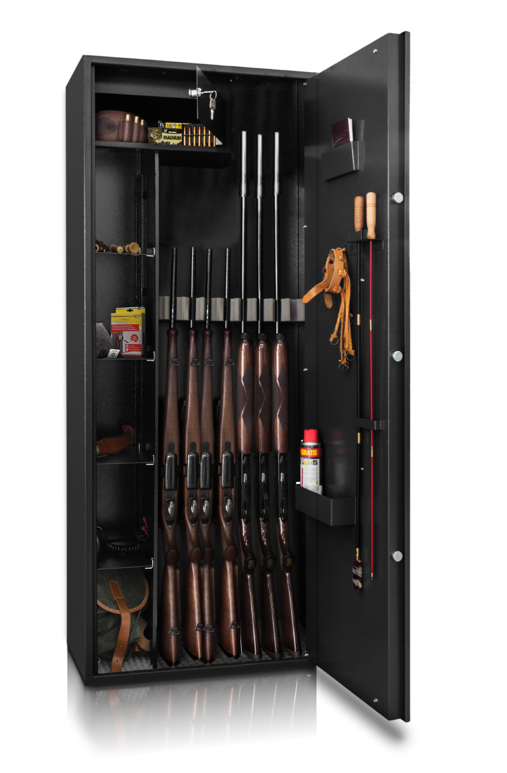 4 db állítható magasságú polccal, 7 db sörétes, golyós lőfegyver tárolására elegendő hellyel..